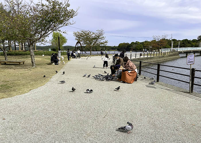 かわりに増えたのがハト。 トキワ湖のほとりに「白鳥に餌を与えてはいけません。病気になります。」の看板があるためか、みんな池に背を向けてハトに餌をやっています。 ハトの数も増えましたが、警戒心ゼロでウォーキング中も全く、よけてくれないので、こちらがハトに道を譲るありさまです。 ○国では、ハトはすぐに捕まえて食べてしまうので、公園にハトはいない と言いますが、本当かなー?。 日本のハトは幸せですね。